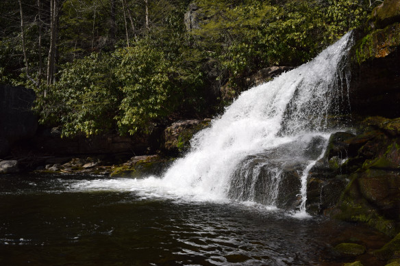 At the bottom, the sound of the stream overtook the clattering rocks and was calming. The downstream trail rose and fell along the creek. Mountain laurel, fallen branches and rock were frequent obstructions. I listened ahead for the sound of the waterfall I knew was there. I heard it or imagined it, a murmur different from other sounds, teasing louder downstream, a sound like human voices in a far-off crowd. Eventually the rumble and mist of the falls appeared ahead in the little valley and overtook the sounds of birds and breeze. This waterfall, like all waterfalls grand or tame, had power as discreet as gravity. From above or below, the 20-foot falls command all passersby to pause. There appeared to be a nearly flat spot, right sized for a one-man tent and stone fire ring, a little further ahead and higher on the right. The other option was to ford the stream and continue working downstream to find a campsite on the trail to the river. The high site had advantages. The ground might be drier, especially in the morning, than along the stream. One could see the stream below and enjoy the roar of the falls. It was a safe perch for a solitary camper.